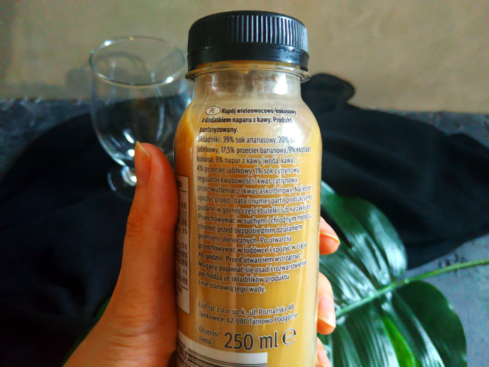 Składniki: 39% sok ananasowy, 20% sok jabłkowy, 17,5% przecier bananowy, 9% ekstrakt z kokosa , 9% napar z kawy (woda, kawa), 4% przecier jabłkowy, 1% sok cytrynowy, regulator kwasowości: kwas cytrynowy, przeciwutleniacz: kwas askorbinowy