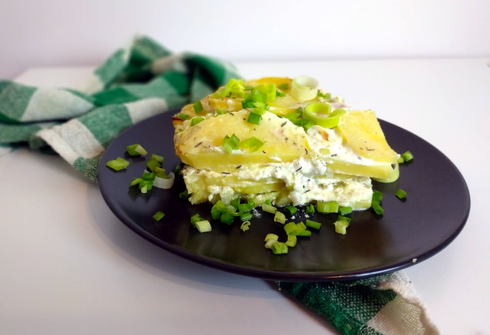 - Dno naczynia żaroodpornego wyłóż pokrojonymi w plastry ziemniakami. Następnie posmaruj farszem z pora i jogurtu. Układaj na przemian warstwy do momentu skończenia się wszystkich składników. Naczynie przykryj pokrywką.