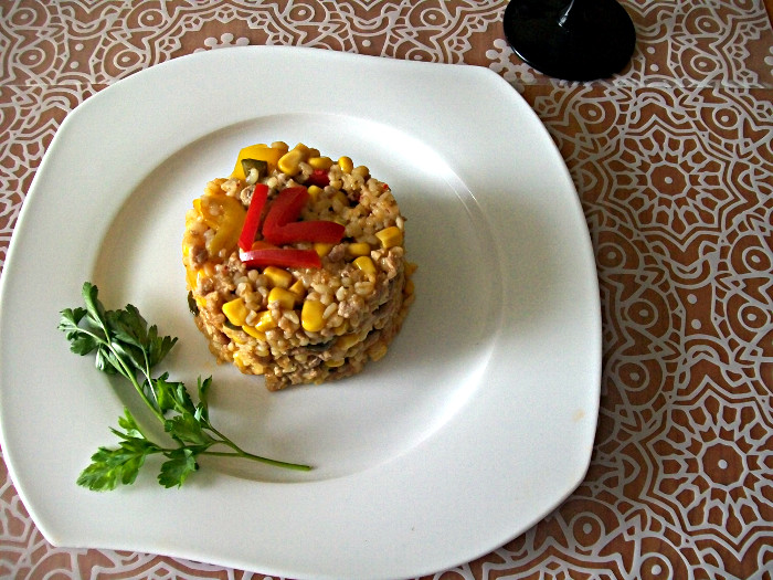 Zrobienie zdjęcia nie było łatwe, bo kasza przypomina breje w ciemnym kolorze, ale przecież nie z takimi potrawami radzą sobie szefowie kuchni. Jeżeli chcecie aby każde danie, będące jedną wielką breją zachwyciło waszych gości, sprawcie sobie specjalne pierścienie do formowanie potraw. Następnie wystarczy wykorzystać do ozdoby kawałek warzywa, użytego do jej przygotowania, zieleniny lub świeżych ziół. Ja uwielbiam dekorować wszystko natką zielonej pietruszki. Jest ona łatwo dostępna, tania i dodaje kolorów potrawie. Swoje kaszotto z kaszy bulgur urozmaiciłam kolorystycznie wykorzystując różnokolorowe papryki.