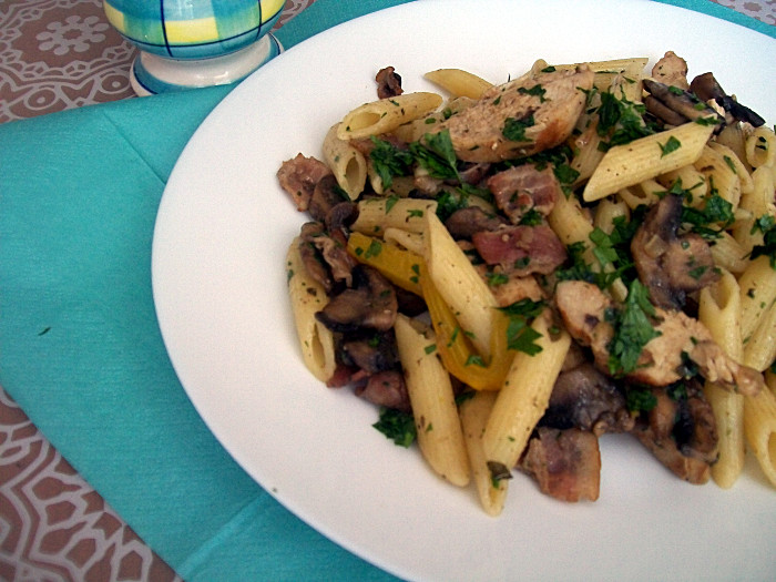 12. Do miski wrzuć makaron, pokrojoną paprykę, pieczarki z boczkiem oraz pokrojone w paski filety z kurczaka. Całość wymieszaj i posyp posiekaną natką pietruszki.