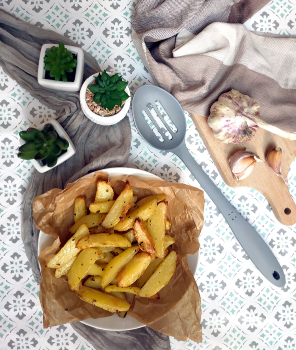 Pieczone ziemniaki to idealny dodatek do dań mięsnych, a także sprawdzają się świetnie jako przekąska z różnorodnymi dipami. Można je przyprawić na tysiąc sposobów, jednak ja postawiłam na klasykę. Tymianek, rozmaryn, majeranek, czosnek i odrobina gałki muszkatołowej to wszystko czego potrzebujecie aby przygotować pyszne i delikatne w smaku ziemniaki z piekarnika. Najlepiej użyć świeżych ziół, wtedy są naprawdę aromatyczne.