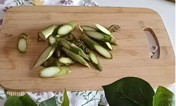 - Tak przygotowane szparagi pokrój nożem w skośne plastry. Plaster powinien mieć ok. 0,5 cm długości.