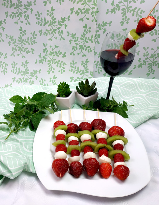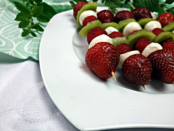 Szaszłyki owocowe to świetna przekąska w letnie dni. Mogą stanowić atrakcyjny owocowy deser zarówno dla dzieci jak i dorosłych. Sprawdzą się również jako orzeźwiająca przekąska podczas letnich przyjęć. Można przyrządzić je na mnóstwo sposobów w zależności od tego jakie owoce lubimy. U mnie są to truskawki, maliny oraz kiwi, których słodki smak owoców przełamałam poprzez dodanie kulek z sera mozzarella.